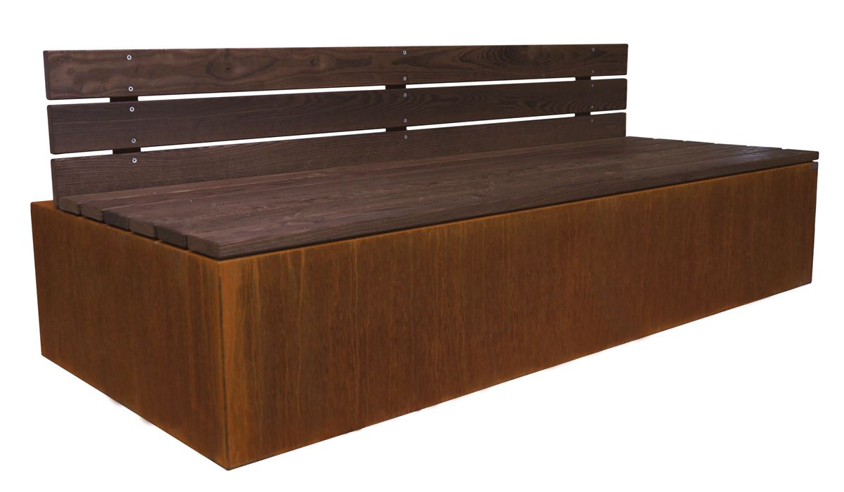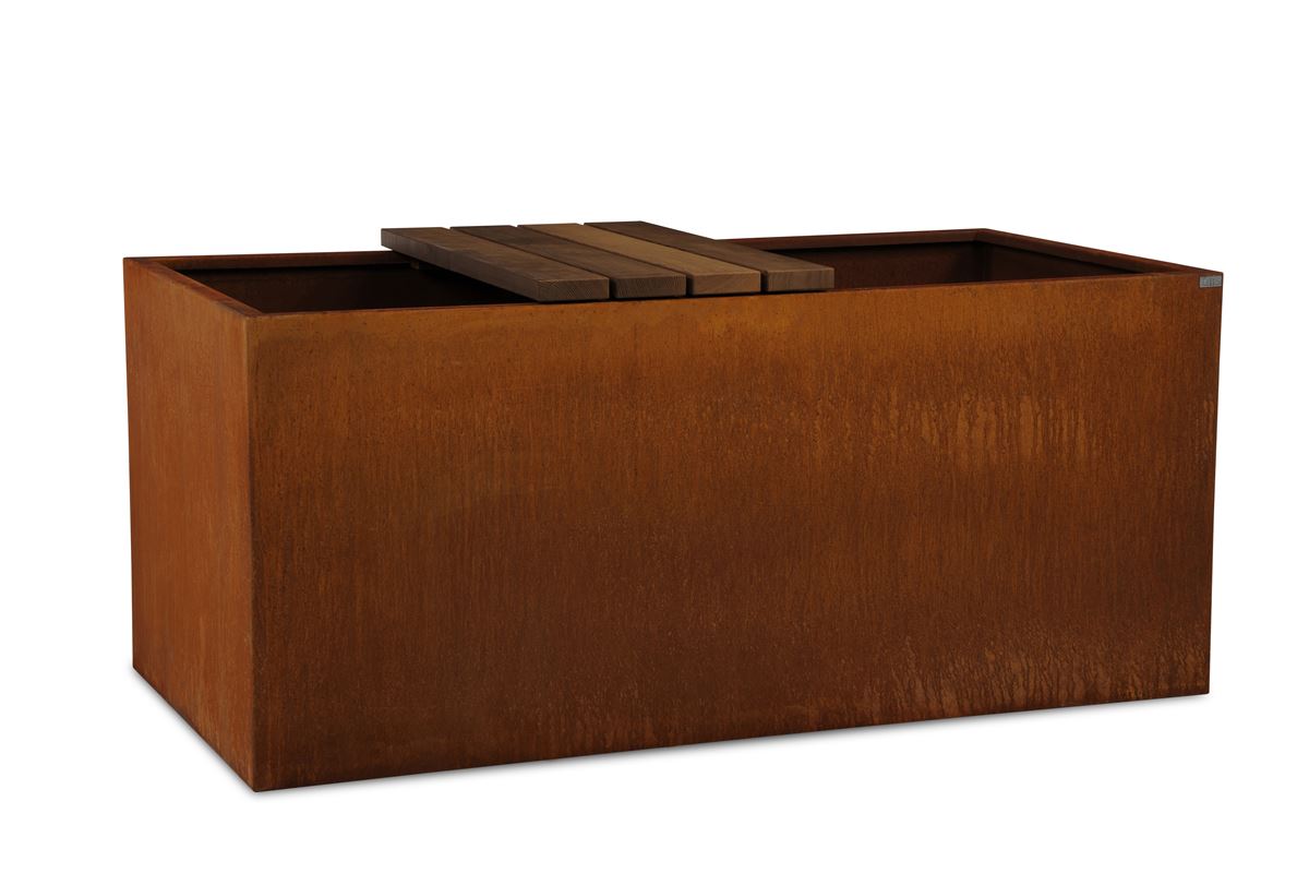 Die stabile Aufbewahrungsbox aus Cortenstahl, lädt im eigenen Garten, Terrasse, Balkon und im Indoor Bereich zur erholsamen Pause vom Alltag ein. Die zwei geteilte Bankauflage aus FSC zertifiziertem Holz aus Deutschland ist einfach abzunehmen, sodass Sie den Kasten einfach zu einer Truhe umfunktionieren können, um in der Nacht oder wenn es regnet Kissen, Auflagen, Gartengeräte wie Schaufel und Spaten einfach zu verstauen.