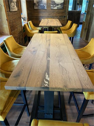 Die Tischplatte wird aus hochwertiger Altholzeiche gefertigt, die durch ihre natürliche Maserung und einzigartige Struktur besticht. Jedes Stück ist ein Unikat mit individuellem Charakter. Befestigt wird die massive Altholzplatte mit Edelstahlschrauben und Kunststoffabstandhaltern, die für zusätzliche Stabilität sorgen. Auf Anfrage ist die Tischplatte auch in anderen Holzarten erhältlich – wir freuen uns auf Ihre Anfrage!
