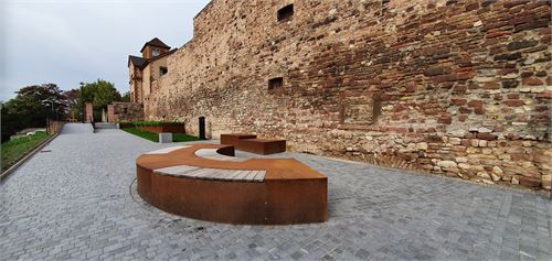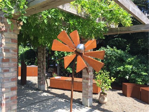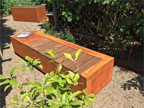 Die Edelrost-Optik des Cortenstahls harmoniert mit den Parkbäumen und bildet gleichzeitig einen schönen Kontrast zu einer sommerlichen Bepflanzung oder Schnee im Winter.