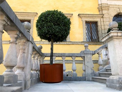Pflanzgefäß R500 – runde Form, markante Nähte, aus vier Teilen geschweißt, mit Schattenfuge, mit Bodensockel ca. 100mm und abnehmbarer Sockelblende für einen einfachen Transport mit Hubwagen oder Gabelstapler.