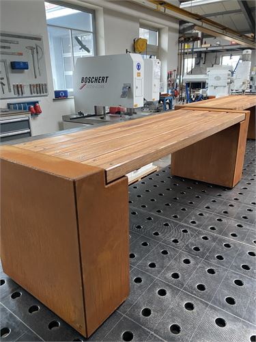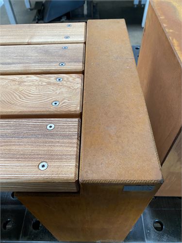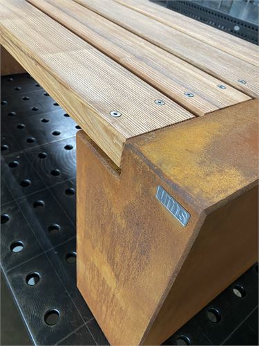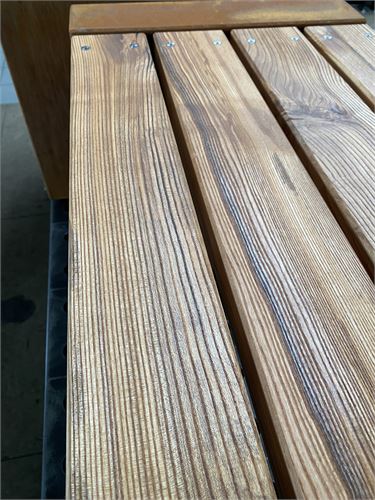 Sitzbank 1034 – in Edelstahl oder Cortenstahl erhältlich, sichtbar geschraubte Sitzfläche aus Thermoesche Struktur gebürstet, Oberfläche gewachst