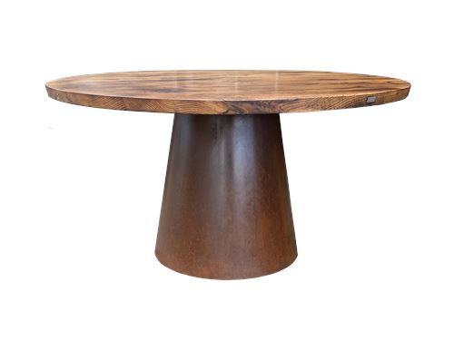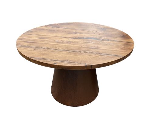 Tisch mit rundem Tischgestell aus Cortentahl Oberfläche geölt, Tischplatte aus Alteiche Ø140cm