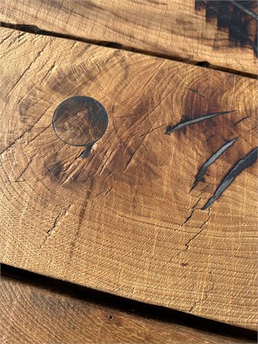 Tisch aus Cortenstahl Oberfläche Edelrost Höhe ca. 740mm und Tischplatte ca. 1850x950mm aus Esche Altholz strukturiert